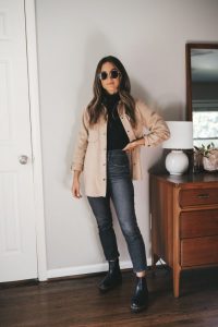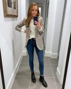 Adicione um toque de formalidade ao seu look usando um blazer ou jaqueta estruturada sobre uma blusa básica, calça de tecido e botas Chelsea.