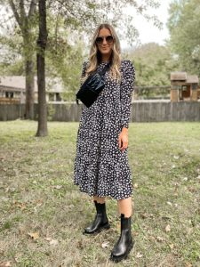 Para uma opção prática e feminina, escolha um vestido de corte clássico que possa ser usado com botas Chelsea. Adicione uma jaqueta estruturada para um toque extra de elegância.