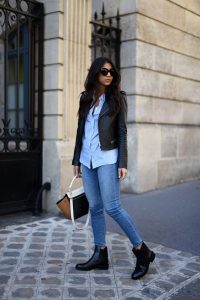 Para um ambiente de trabalho casual, combine sua calça jeans favorita com uma blusa de tecido fluido e botas Chelsea.